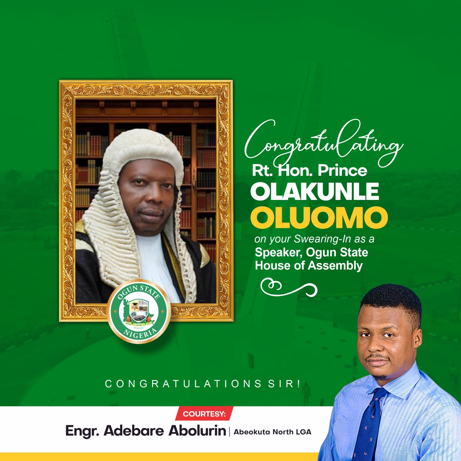 Chief Executive Officer of Iconic Energy Limited, Engr. Adebare Abolurin has congratulated the Speaker of Ogun State House of Assembly, Rt. Hon. Olakunle Oluomo on his reelection for second term, as Speaker for 10th Assembly legislatures.